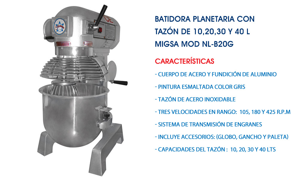 Batidora Planetaria con Tazón de 10,20,30 y 40 L Migsa Mod NL-B20G